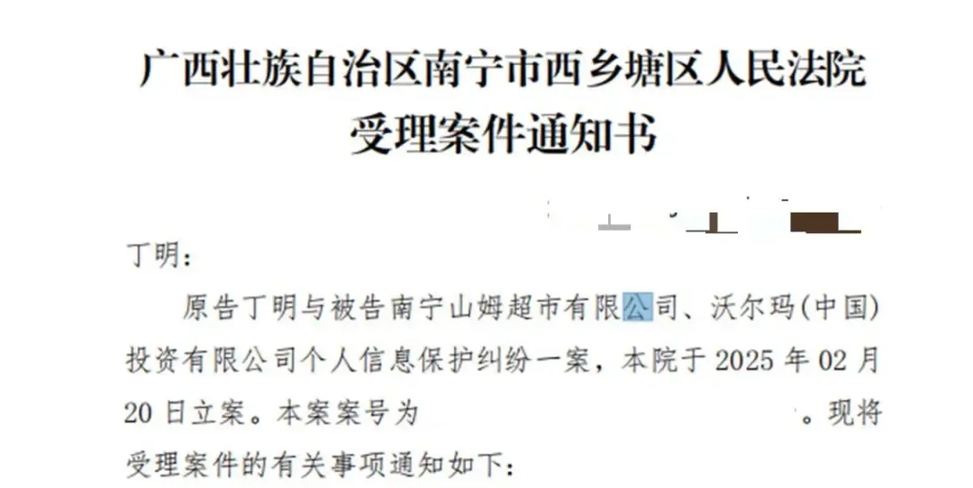 他提供的立案见知书知道,2月20日,原告丁明与被告南宁山姆超市有限公司、沃尔玛(中国) 投资有限公司个东谈主信息保护纠纷一案已在广西壮族自治区南宁市西乡塘区东谈主民法院立案。